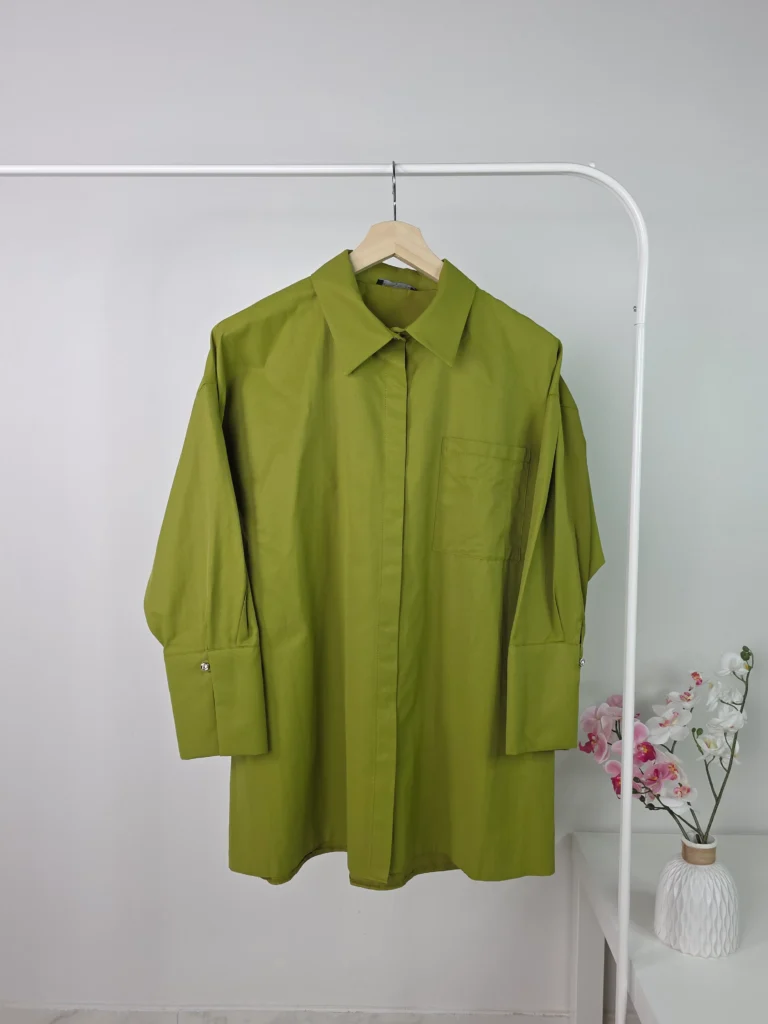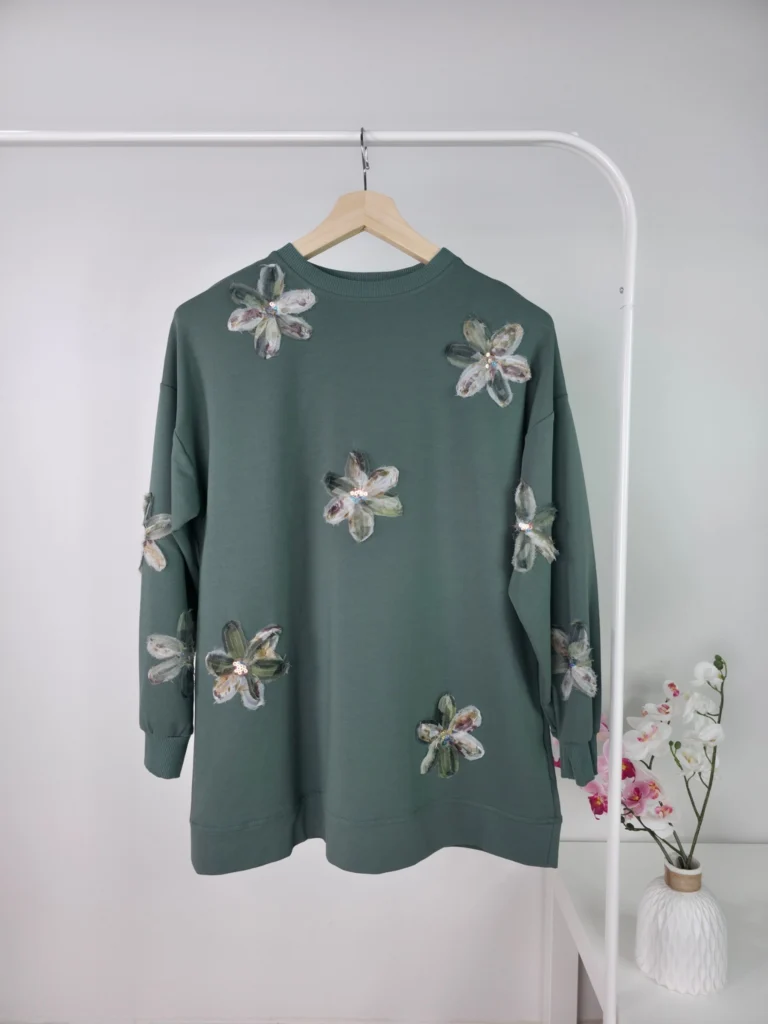 بلوزة طويلة نسائية باللون الأخضر مزينة بزهور بارزة – صناعة تركية