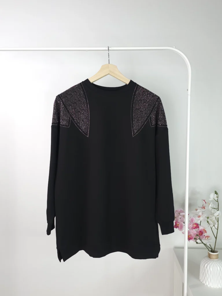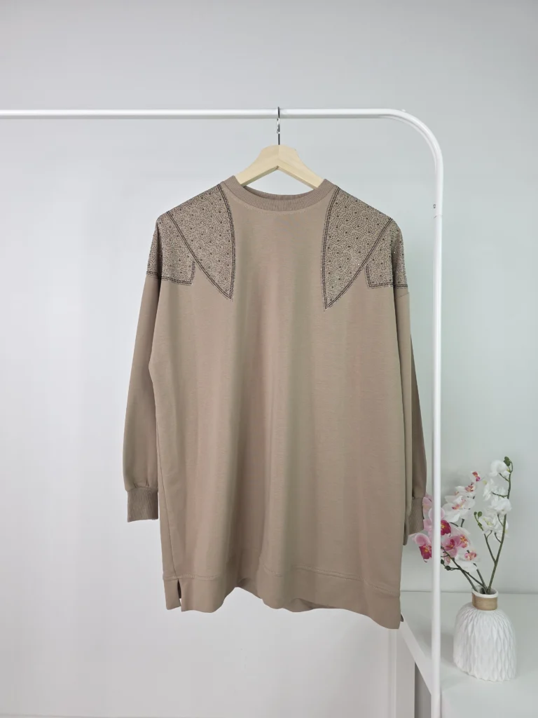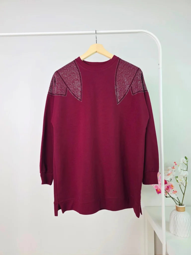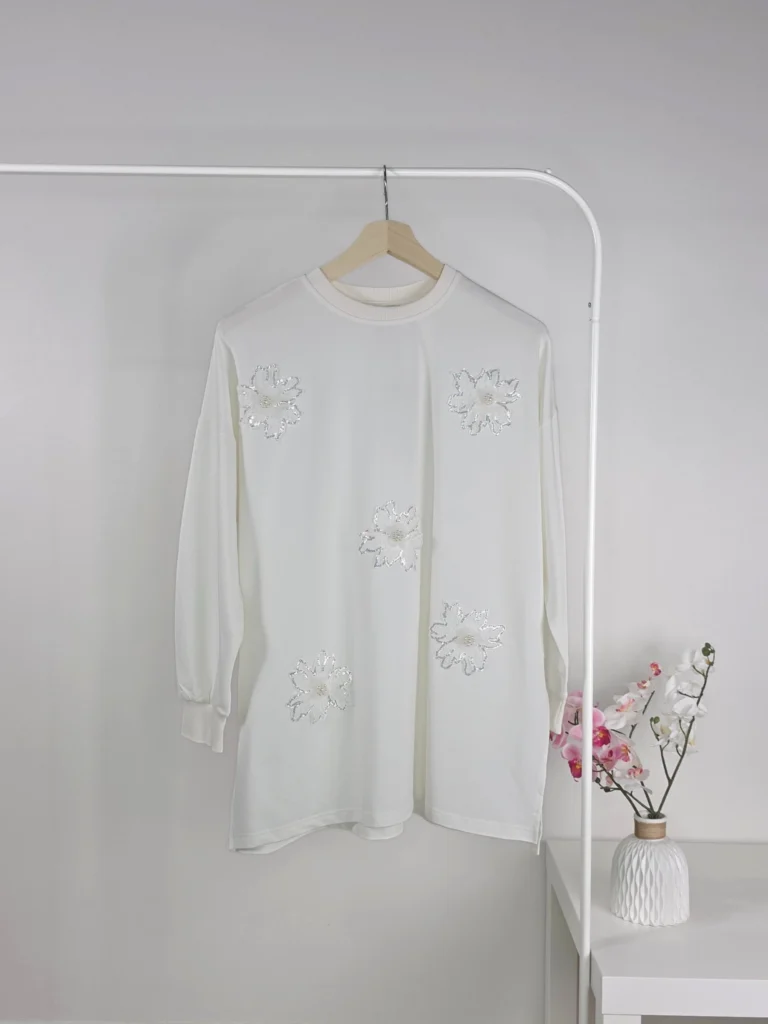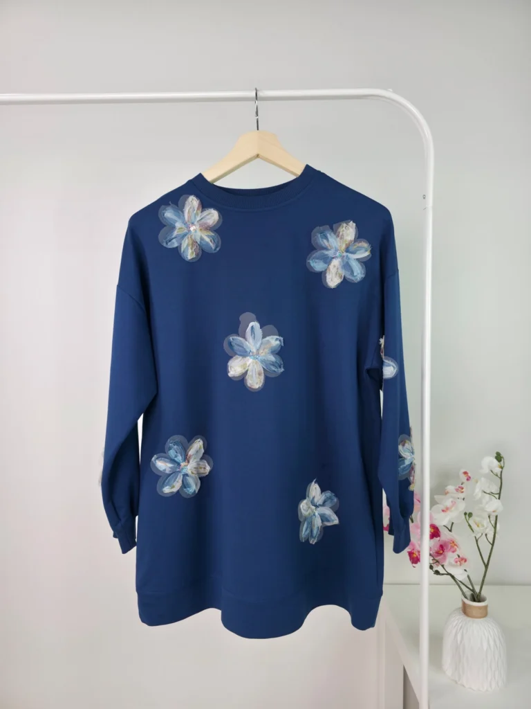 بلوزة طويلة نسائية باللون الأزرق مزينة بزهور بارزة – صناعة تركية