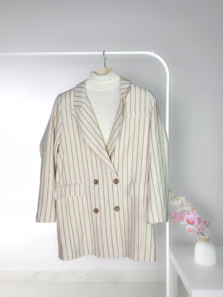 بليزر أوف وايت مخطط باللون البني بأزرار مزدوجة وجيوب أمامية – صناعة تركية