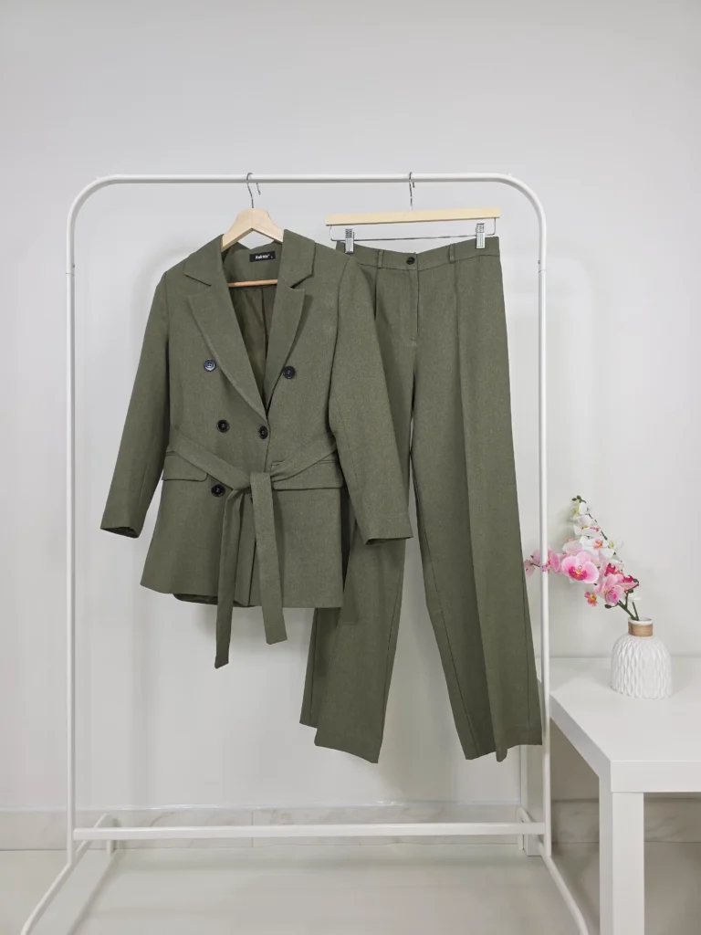 بدلة نسائية باللون الزيتوني – جاكيت وبنطال – صناعة تركية