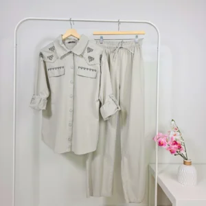 Two-Piece Beige Set (Shirt with Buttons + Pants) with Crystal Details – High-Quality Turkish Manufacturing