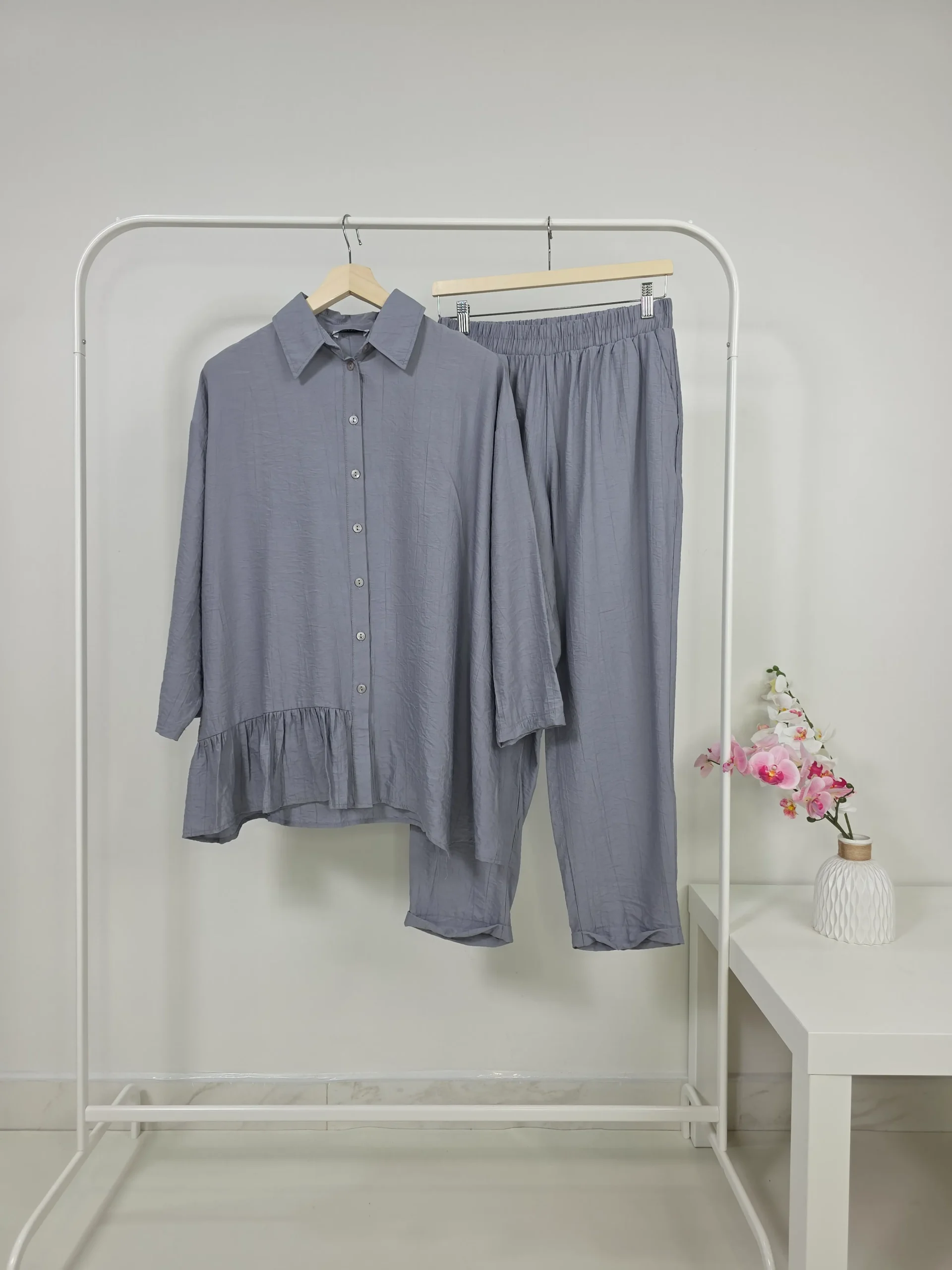 - Elegant two-piece set featuring a blouse and pants in gray color, designed with a lightweight and comfortable fabric perfect for casual everyday wear. The blouse has a classic collar, button-down style, and a chic ruffle detail at the hem. The pants are wide and flowy for a stylish relaxed fit.