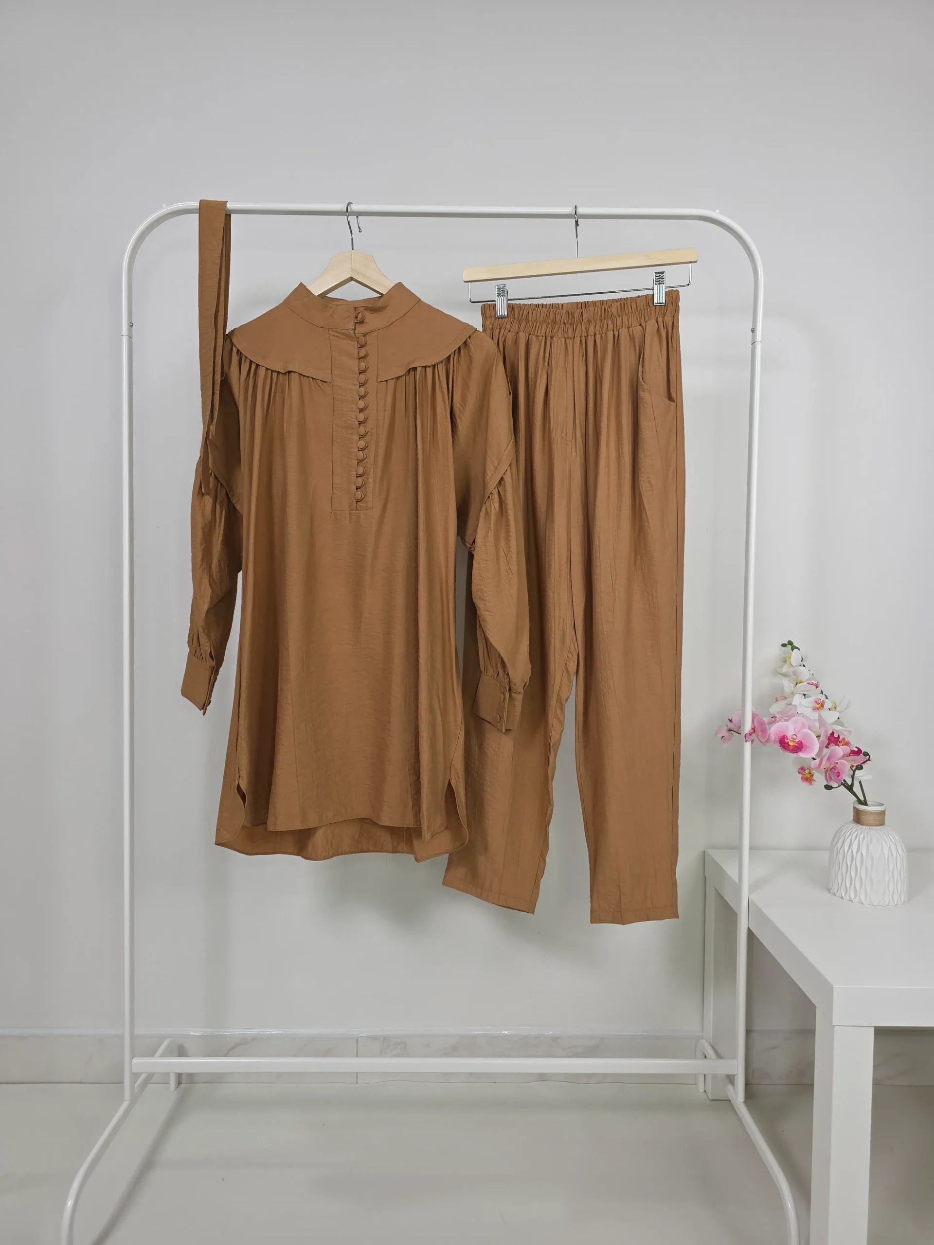 - Elegant two-piece set in a trendy honey color, featuring a long blouse with front buttons and long sleeves for a modest look. The pants come with a comfortable elastic waist, making it ideal for daily wear and casual outings. A practical and stylish outfit that combines comfort with elegance.
