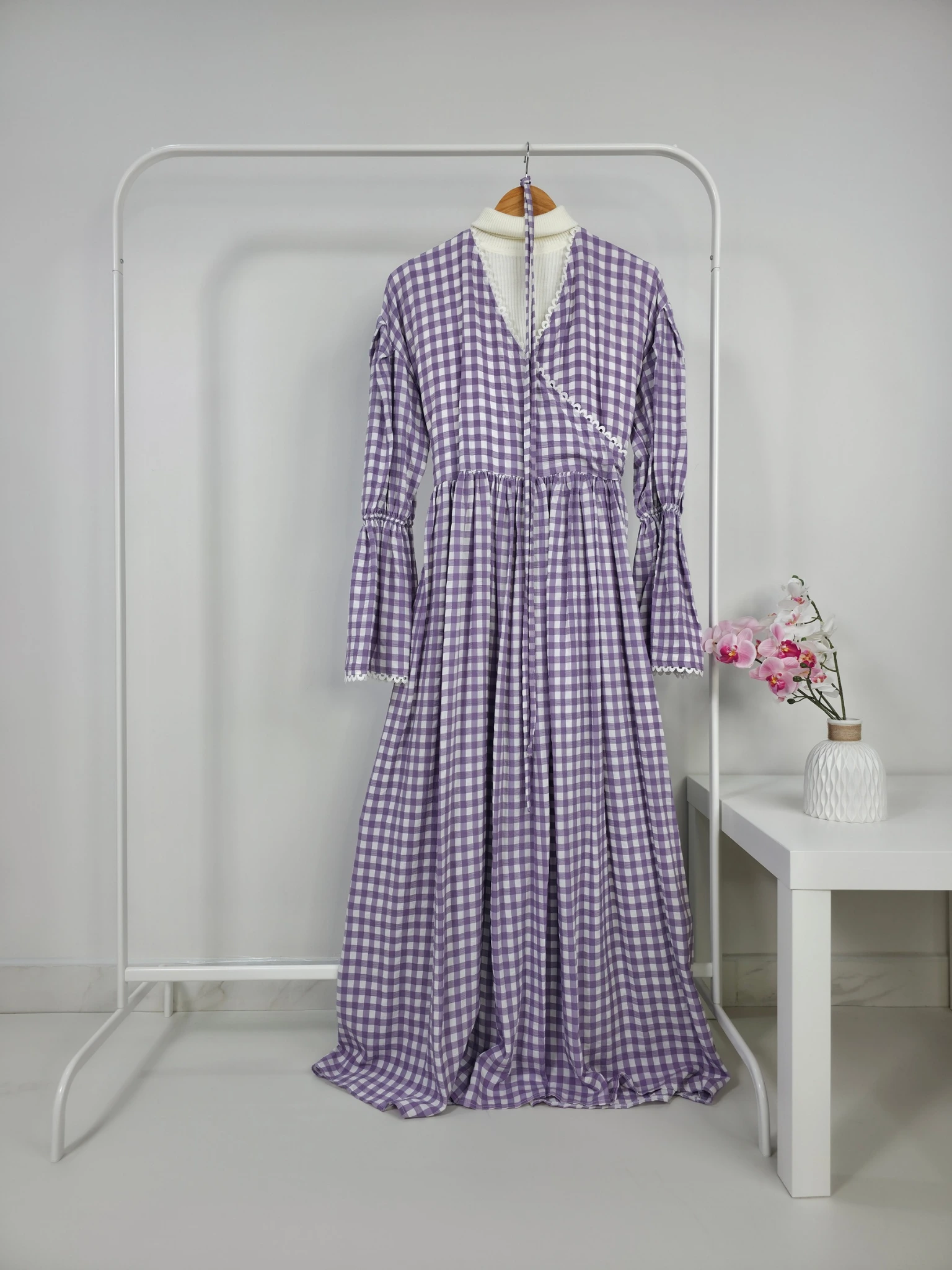 - Elegant long purple checkered (plaid) dress with delicate white lace accents that add a feminine touch. Features a wrap design with waist tie for a stylish and comfortable fit. The wide sleeves with lace trim enhance its charm, making it perfect for daily wear or casual occasions.