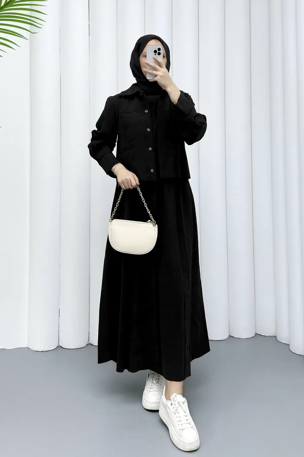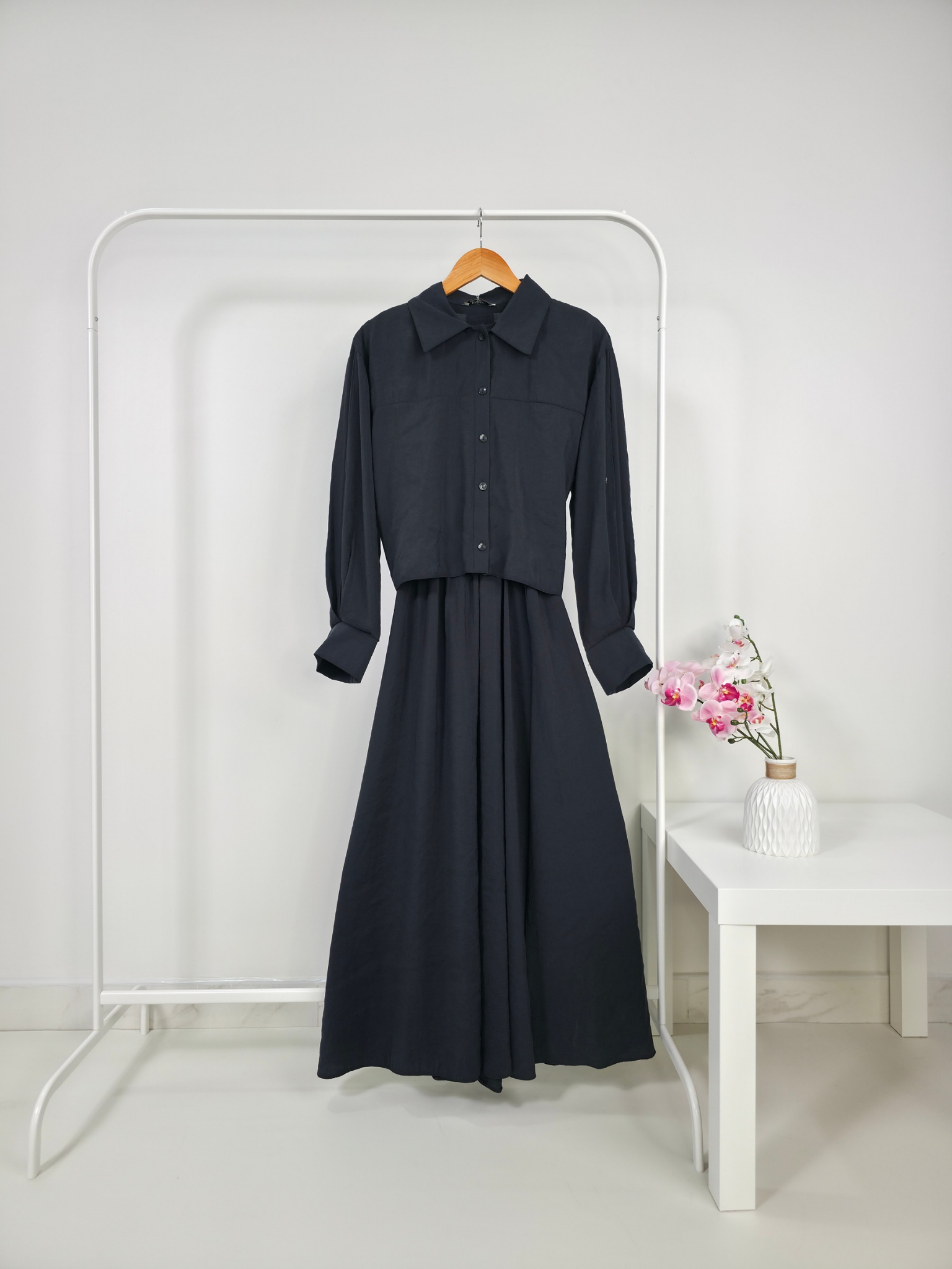 - Elegant two-piece dress consisting of a button-down shirt and a wide skirt in black. Its classic design adds a modern touch while providing comfort and elegance, making it suitable for daily wear or casual occasions.