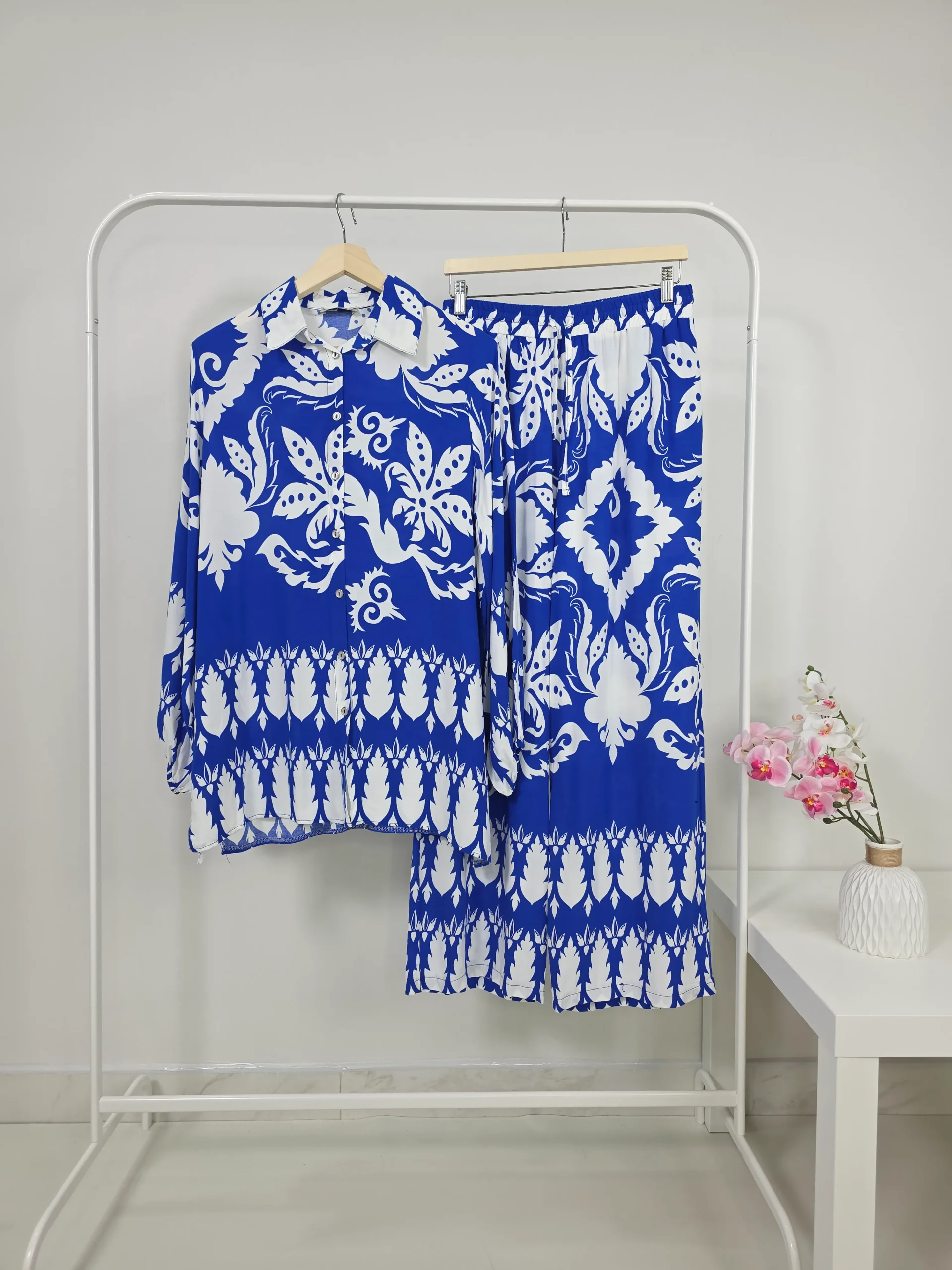 - Elegant two-piece set in vibrant blue with modern white patterns, adding a chic touch to your look. Features a loose button-down shirt paired with comfortable elastic-waist pants for a stylish yet practical outfit. Made from soft and lightweight fabric, perfect for daily wear and casual outings.