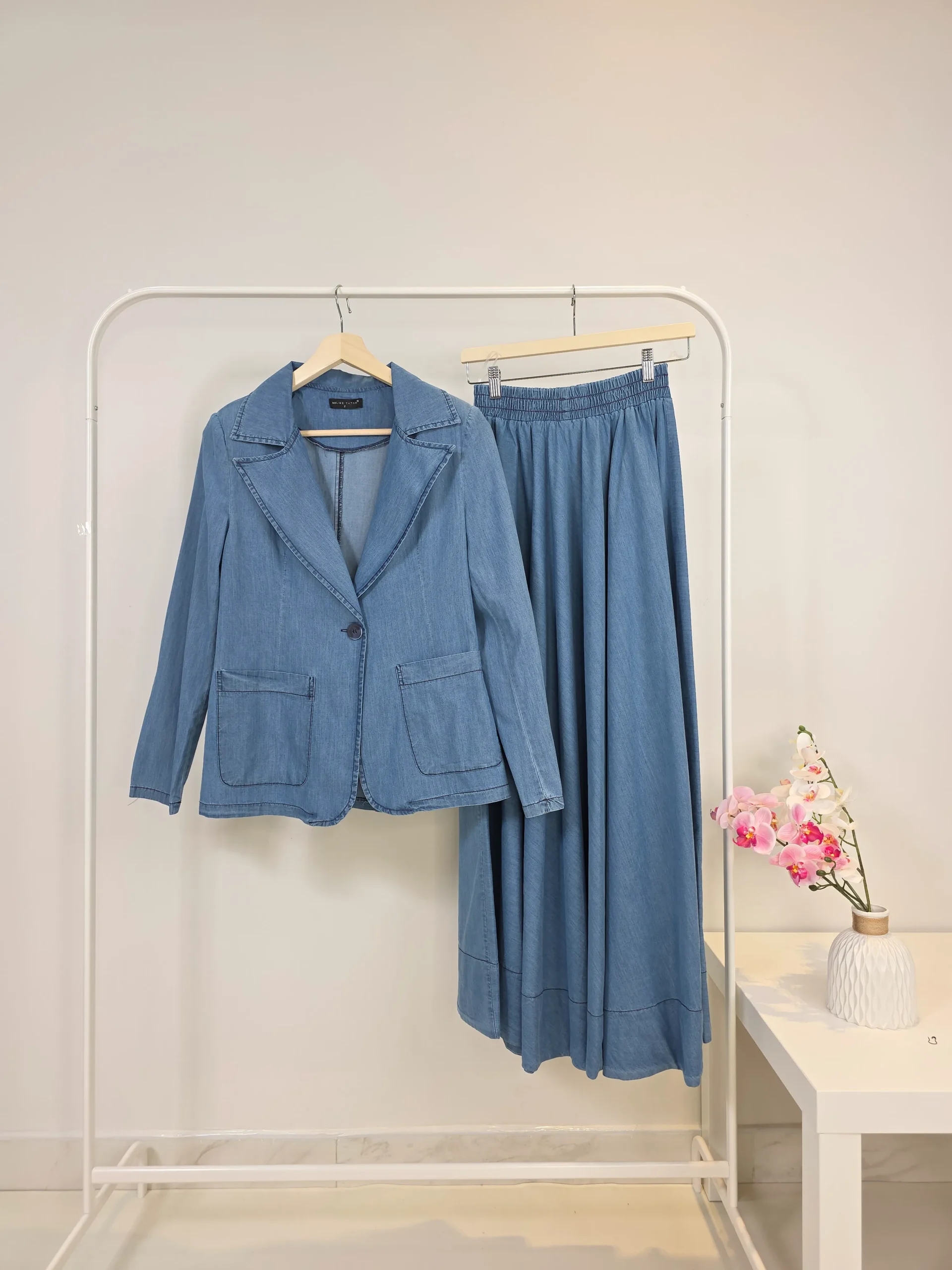 - A stylish two-piece set featuring a blouse and skirt made of light denim fabric, offering comfort and elegance for everyday wear. Designed with a practical and breathable material suitable for warm weather, this set combines a simple modern look with natural femininity. Perfect for daily outings and casual occasions, providing both lightness and charm.