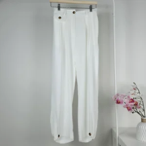 بنطلون نسائي أنيق بلون أبيض مع أزرار بلون خشبي – صناعة تركية