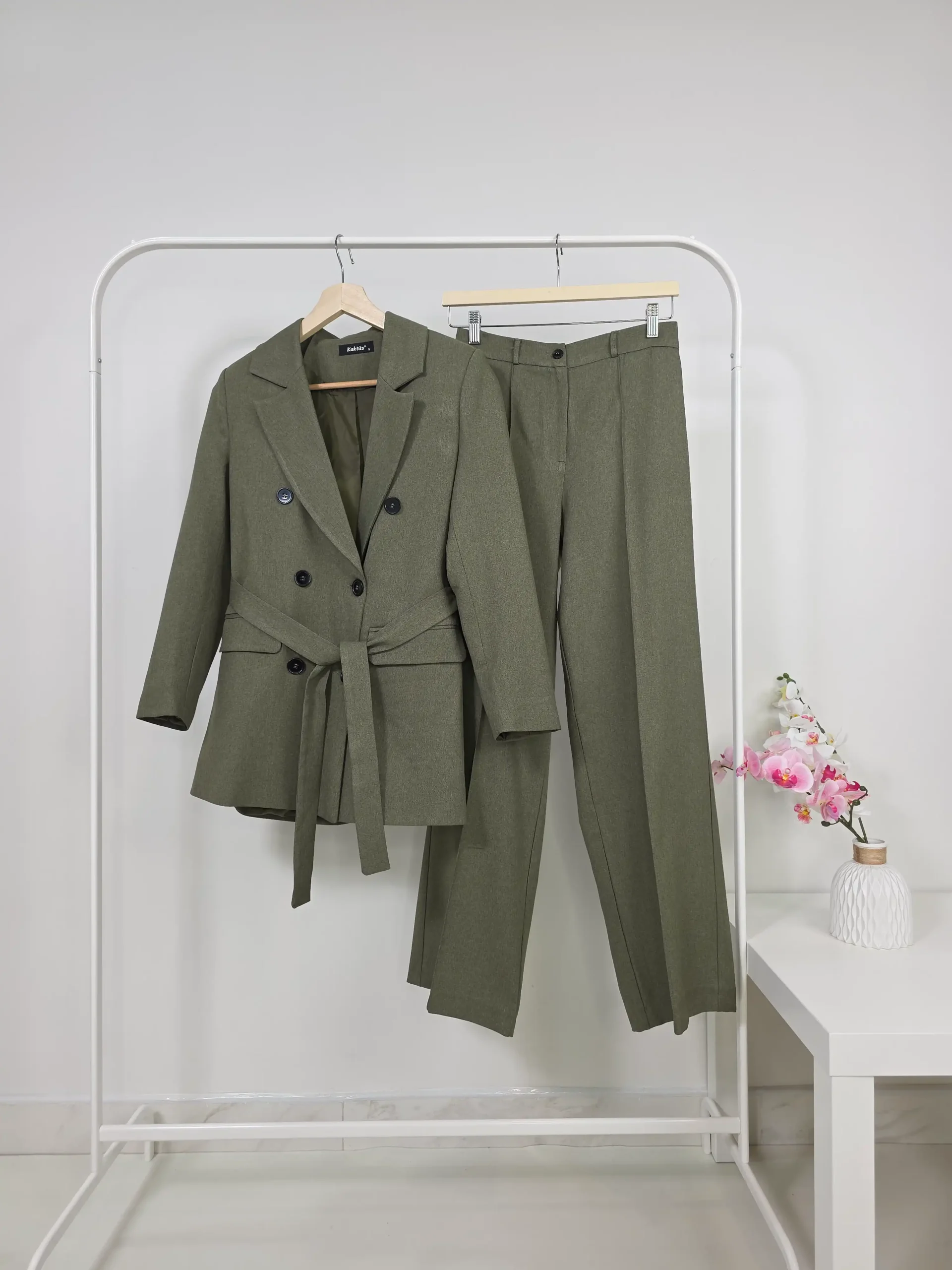 - بدلة نسائية أنيقة باللون الزيتوني مكونة من جاكيت وبنطال، بتصميم عصري يجمع بين البساطة والفخامة. يتميز الجاكيت بأزرار أمامية مزدوجة مع حزام يحدد الخصر لإطلالة متناسقة، بينما يأتي البنطال بقصة مستقيمة أنيقة وطول عملي. خامة مريحة وملائمة للإطلالات اليومية وكذلك للمناسبات الرسمية.