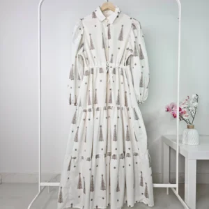 فستان طويل أبيض مزين بتطريز أسود – صناعة تركية