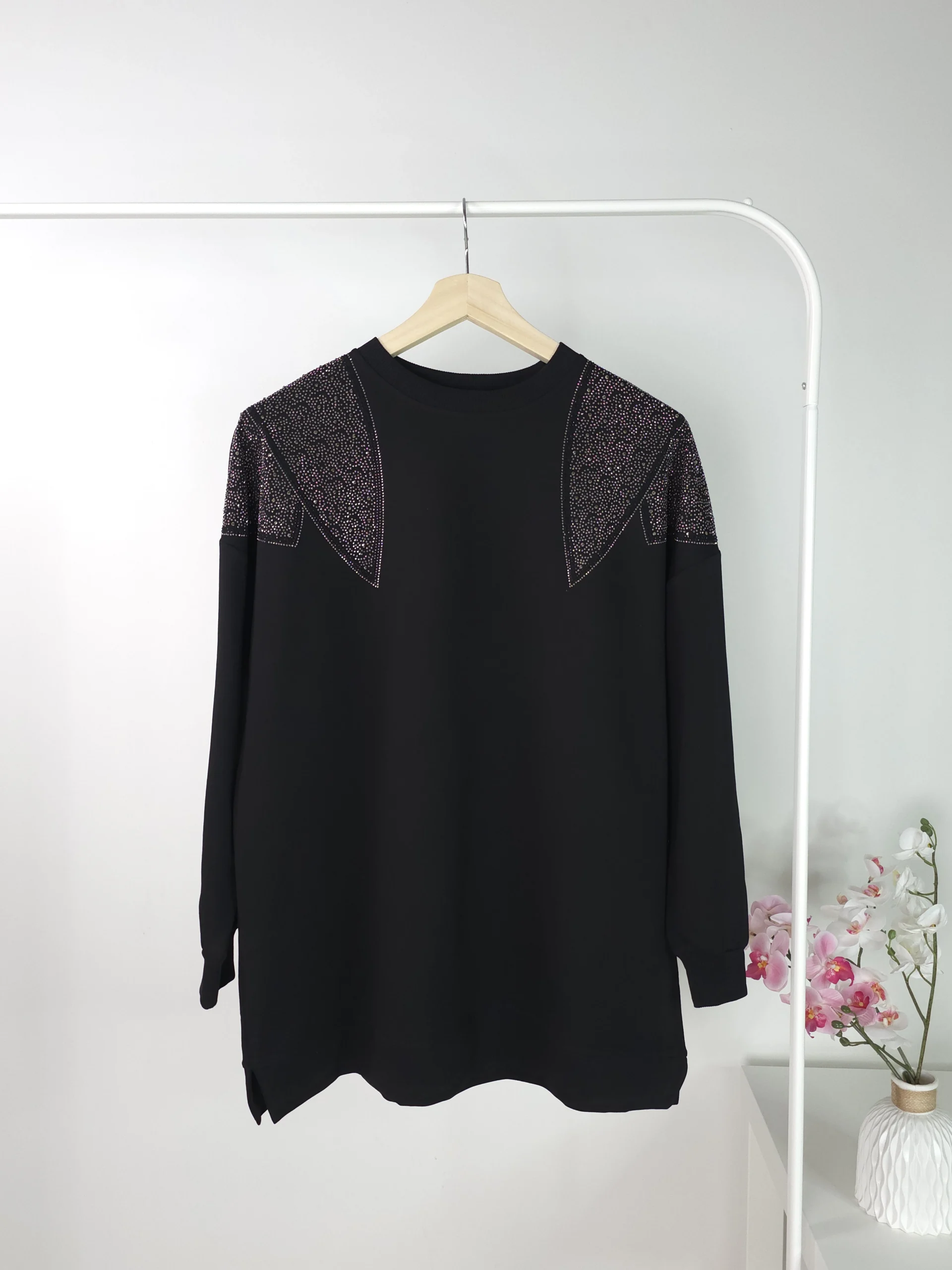 بلوزة طويلة نسائية باللون الأسود مزينة بكريستالات – صناعة تركية