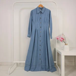 فستان جينز طويل باللون الأزرق الفاتح بأزرار أمامية – صناعة تركية عالية الجودة