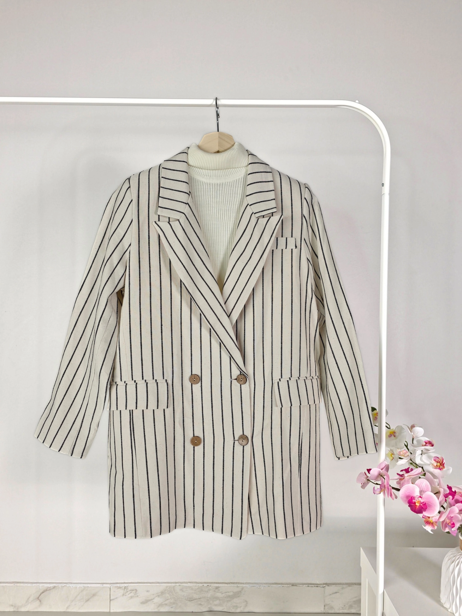 - بليزر أنيق بلون أوف وايت مع خطوط طولية سوداء يمنحك مظهراً كلاسيكياً جذاباً. يتميز بأزرار أمامية مزدوجة وجيوب عملية لإطلالة عصرية تناسب الإطلالات الرسمية والكاجوال