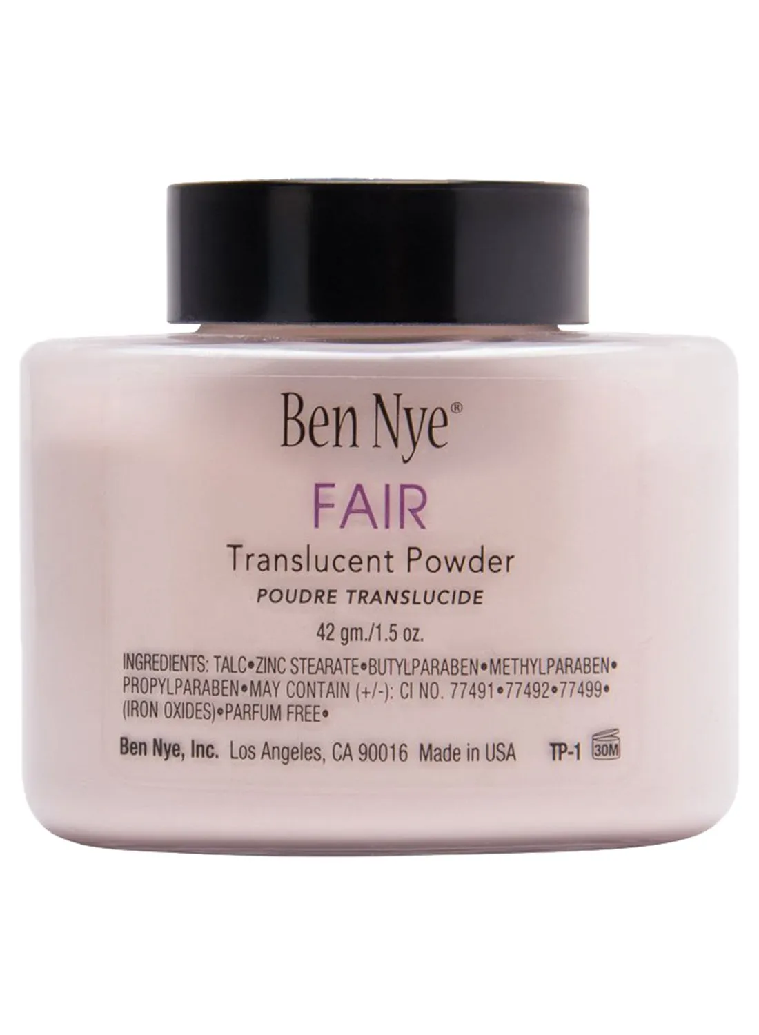- بودرة تثبيت شفافة من Ben Nye بتركيبة خفيفة غير لامعة، تساعد على تثبيت المكياج لفترة طويلة، تقليل اللمعان، ومنح البشرة مظهرًا طبيعيًا وناعمًا.