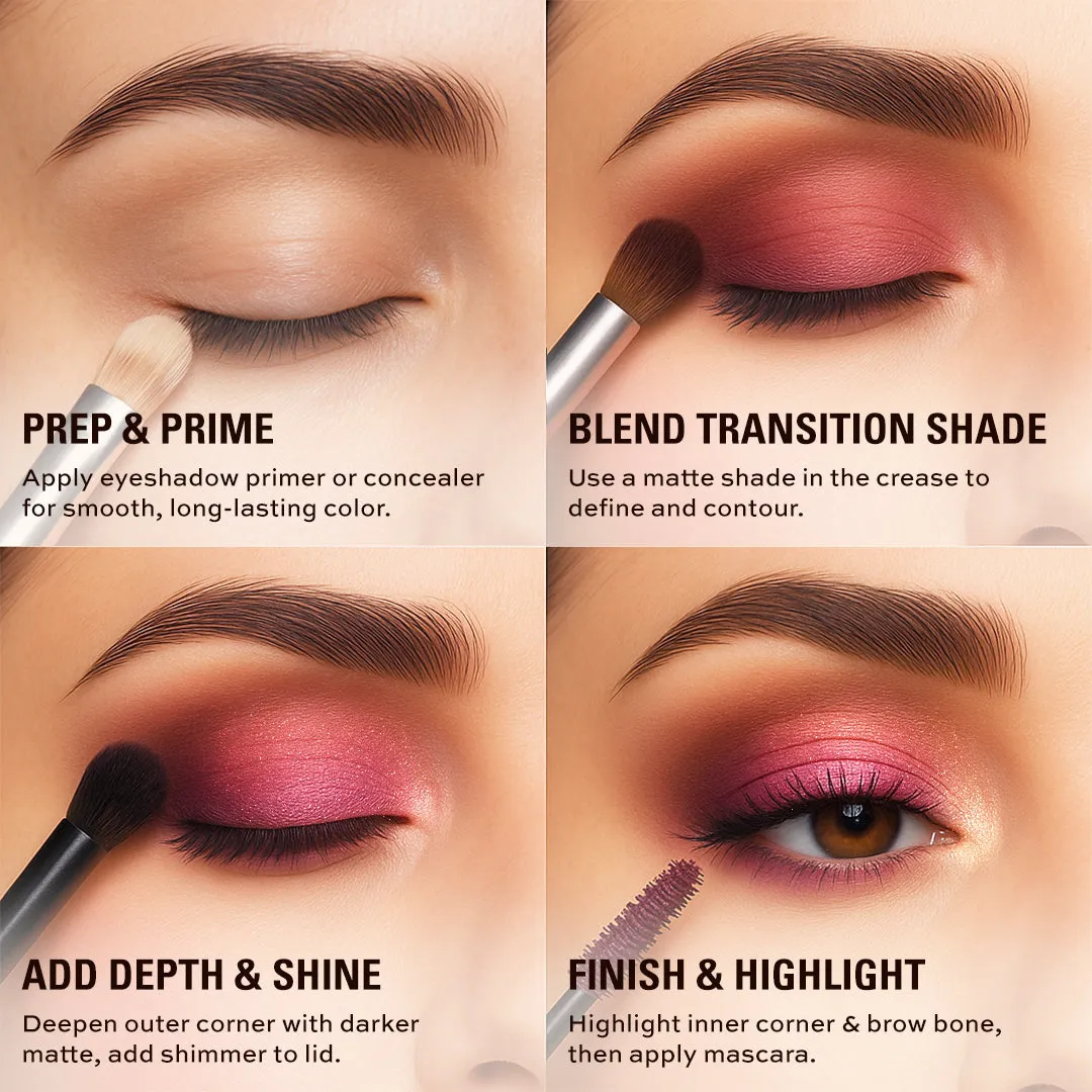 🔹 مساحيق ظلال ناعمة: تمنح لونًا غنيًا ومتجانسًا على الجفون.