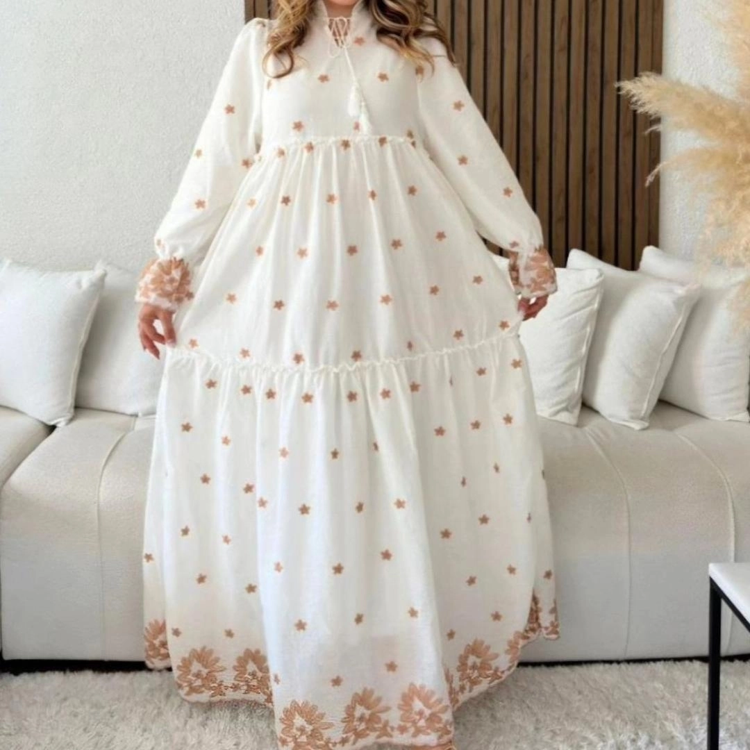 فستان طويل أوف وايت مطرز باللون البني – صناعة تركية