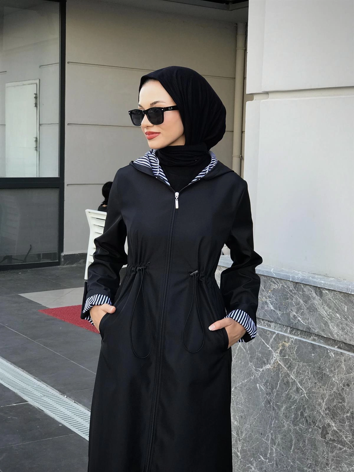 - معطف شتوي هودي طويل باللون الأسود بتصميم عصري بجيوب جانبية عملية وسحّاب أمامي كامل